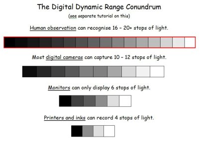 With all this blocking up of colours what you find that while 0 (zero) is Black, 50 also looks black, 100 looks black and it is not until you get to the mid 100 tonal range you start to see shades of grey, so-to-speak. With the compression of colours from capture to output we finish up with a lot of detail that is hidden, particularly in the shadow area.